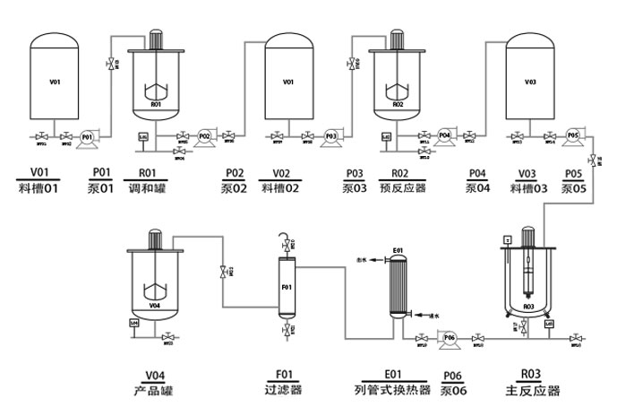 預反應器、主反應器、調和罐、過(guò)濾器、換熱器、高速攪拌器、低速攪拌器、空氣開(kāi)關(guān)等電氣、嵌入式一體化彩色觸控顯示屏。