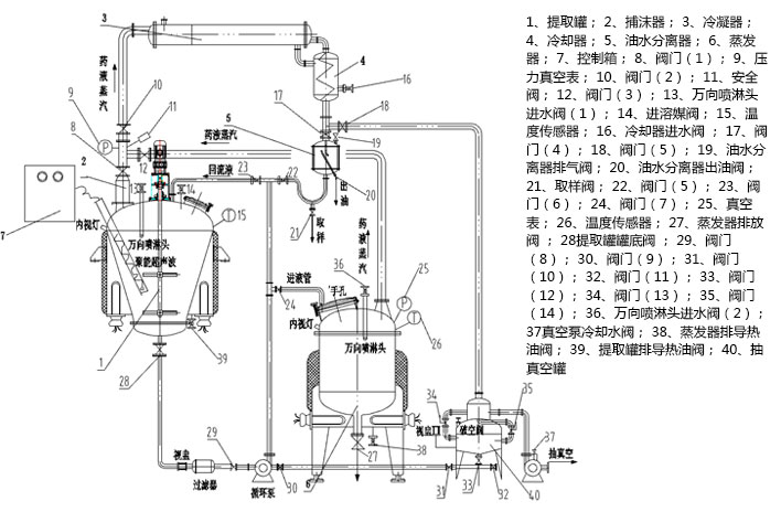提取罐、捕沫器、冷凝器、冷卻器、油水分離器、蒸發(fā)器、電機、超聲波、抽真空罐、循環(huán)泵、真空泵、空氣開(kāi)關(guān)等電氣、嵌入式一體化彩色觸控顯示屏。