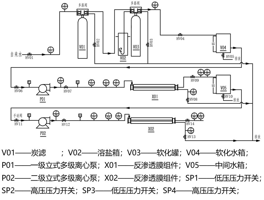 碳濾罐、軟化罐、溶鹽箱、精密過(guò)濾器、軟化水箱、一級立式多級高壓泵、反滲透膜、中間水箱、二級立式多級離心泵、反滲透膜組件、流量計、壓力表、電導率儀、智能儀表、空氣開(kāi)關(guān)等電氣、嵌入式一體化彩色觸控顯示屏。