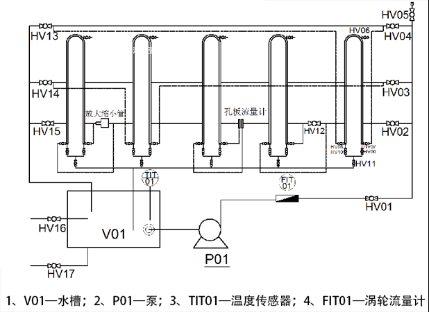 水箱、泵、不同管徑、材質(zhì)的的管子,各種閥門(mén)和管件、渦輪流量計、溫度傳感器、智能儀表、嵌入式一體化彩色觸控顯示屏。